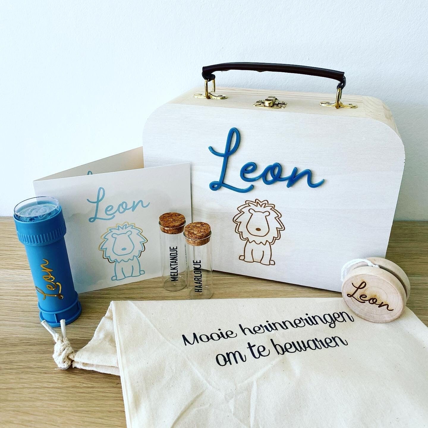 Het kokertje voor melktandjes en het eerste haarlokje zijn standaard inbegrepen in de koffer.