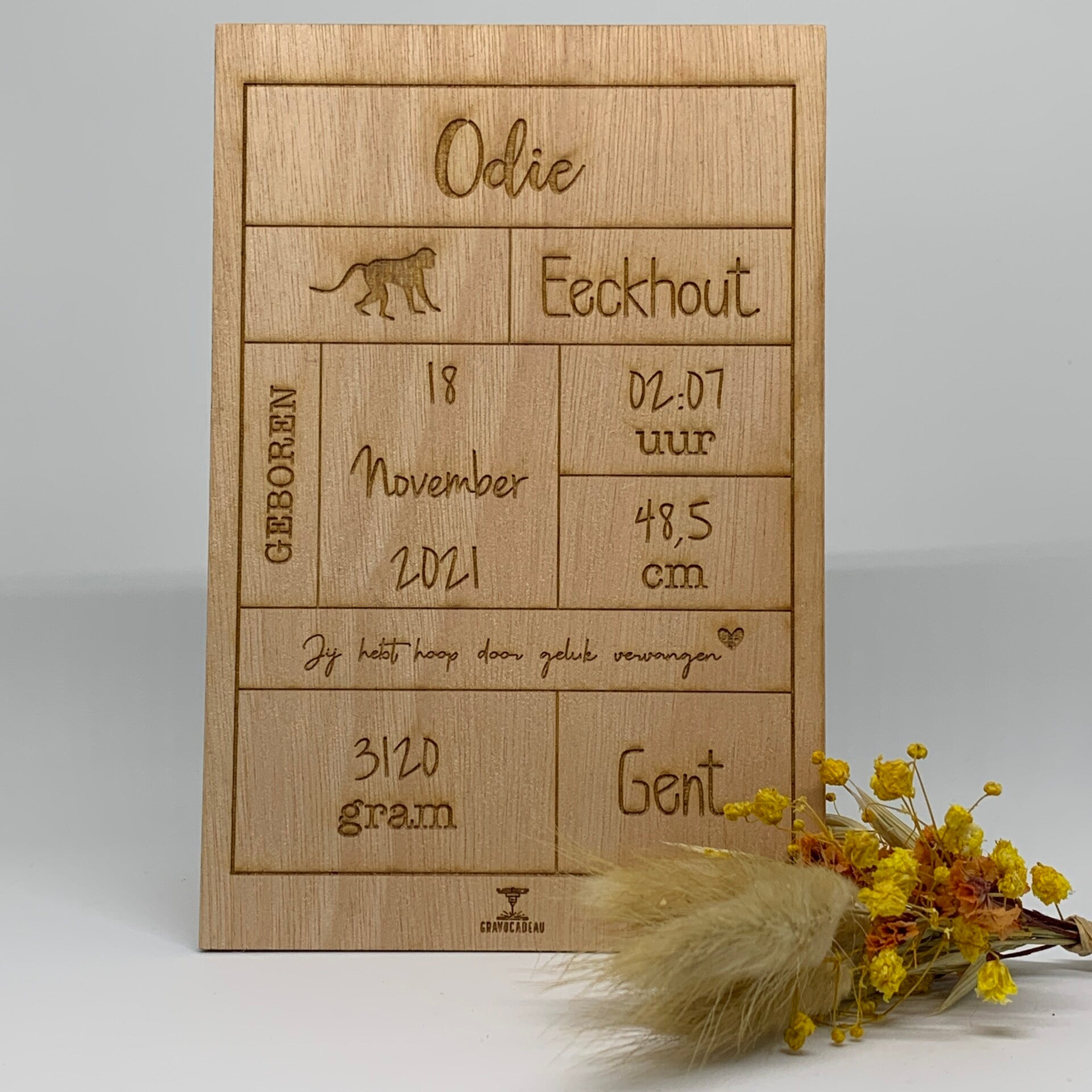 Kondig de geboorte van jouw kleintje aan met deze originele geboorteaankondiging op een houten plankje (3mm)