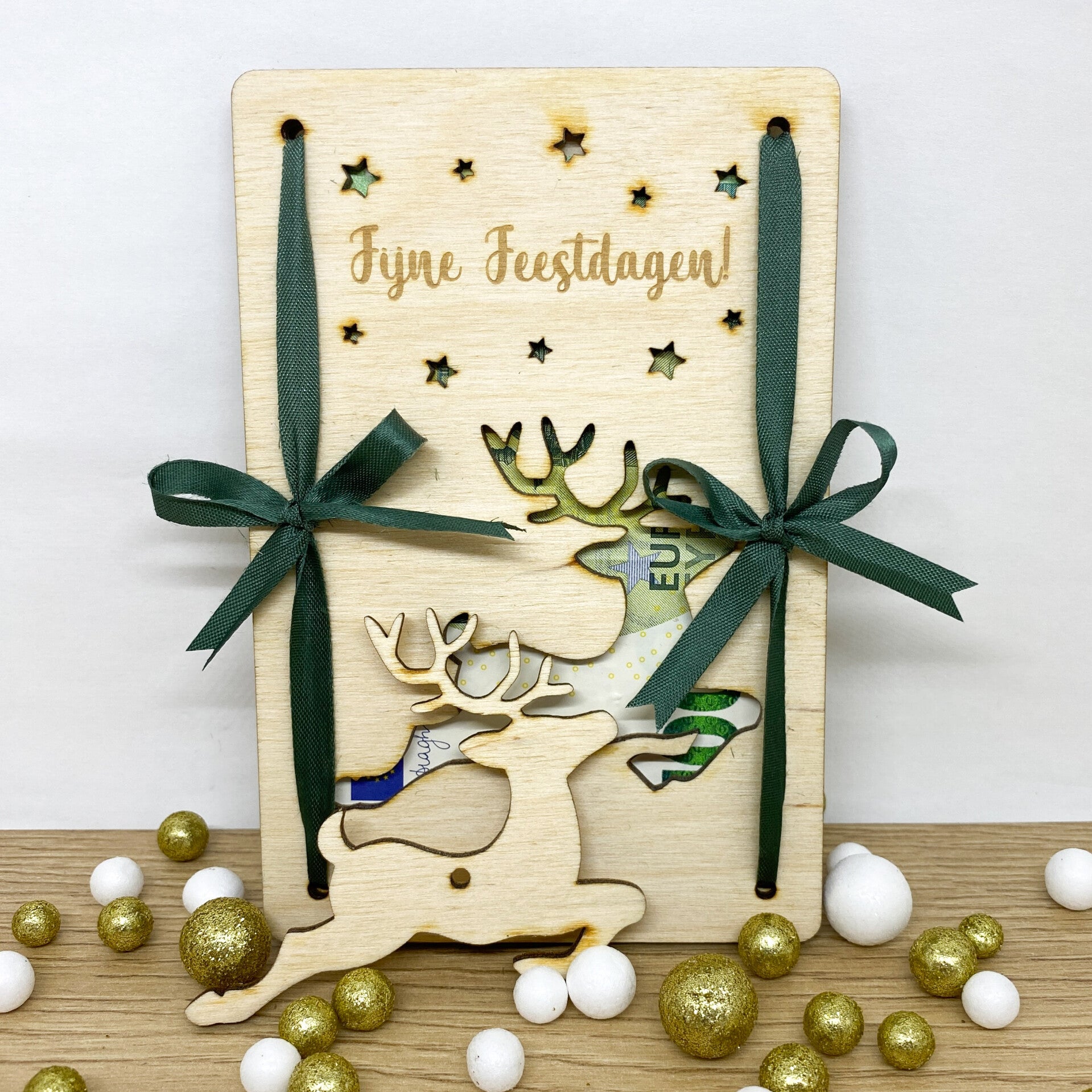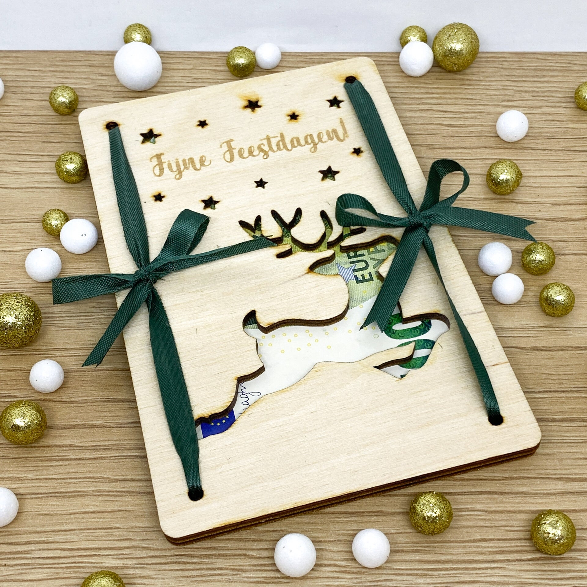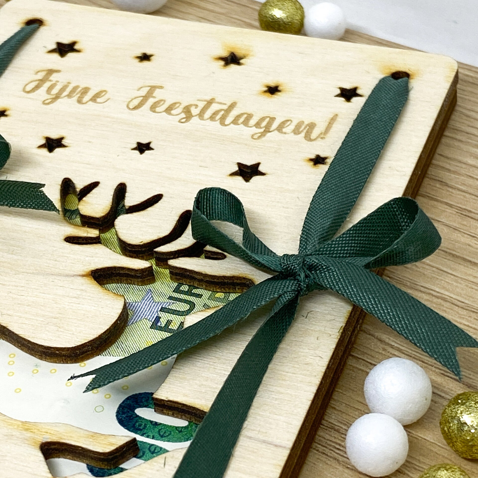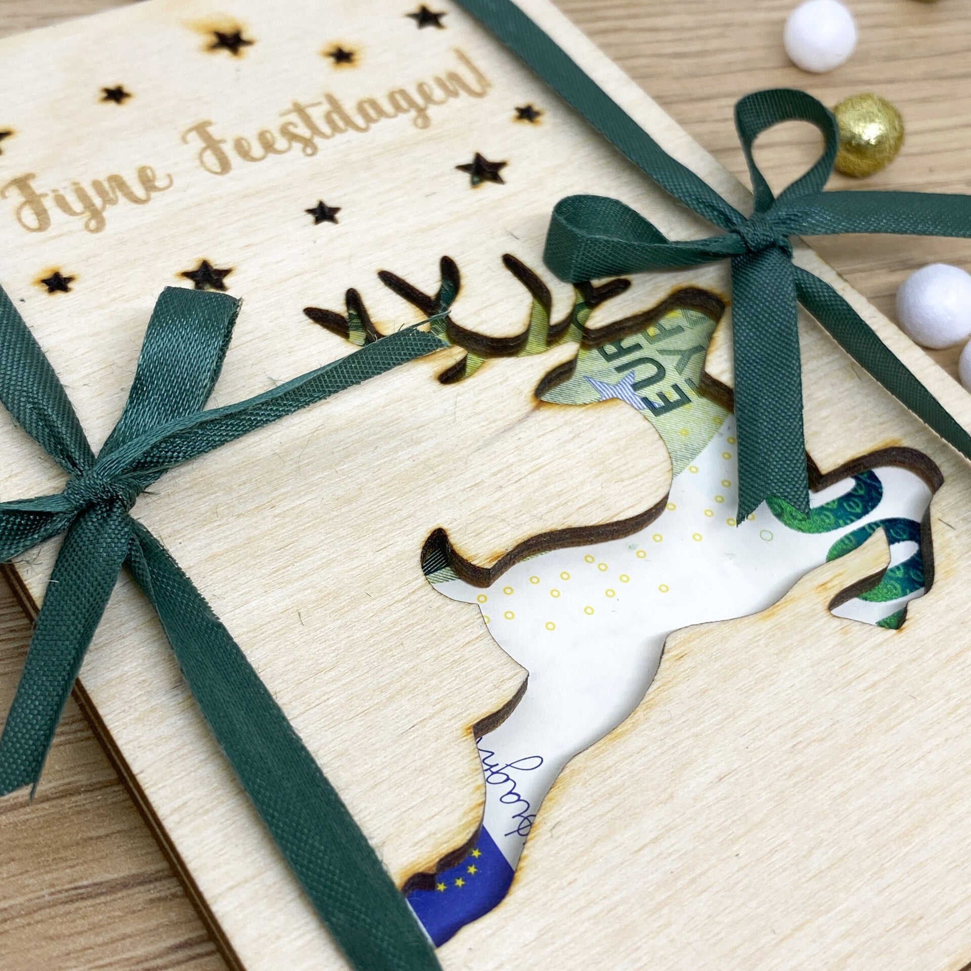 Klem het dan tussen onze geldkaart. Deze bestaat uit twee houten wenskaarten die je met lintjes aan elkaar vastknoopt. Wees gerust, het geld zal nergens naartoe gaan. Of het zou in de portefeuille moeten zijn van wie het krijgt natuurlijk.