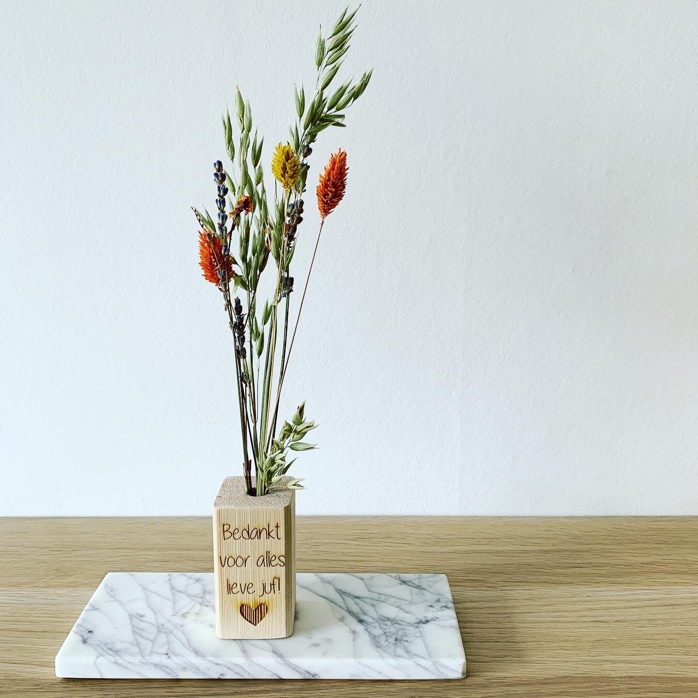 Geef jouw juf of meester een originele bedanking. Dit houten blokje met droogbloemen kan daarnaast ook gepersonaliseerd worden met elke mogelijke boodschap.